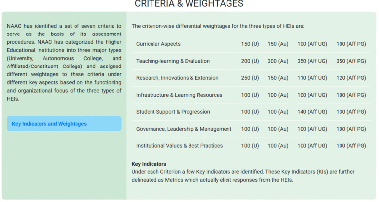NAAC uses a seven-criterion framework to evaluate institutions: